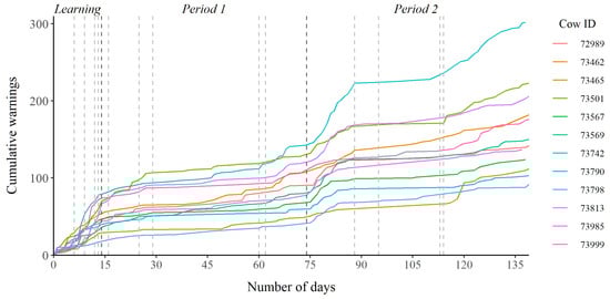 Cumulative number of warnings received by each cow during the three periods. The vertical lines in the plot mark any significant change in the virtual enclosure, where the darker lines indicate the division of the three periods.