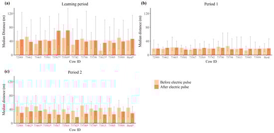 Median distance to the virtual border of each individual cow and the herd collectively, before and after any one individual received an electric impulse during (a) the learning period (), (b) period 1 (), and (c) period 2 (). Error bars represent the interquartile range. An asterisk next to the serial number denotes statistical significance (p < 0.05).