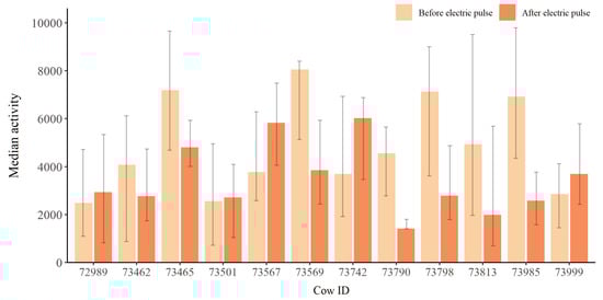 There were no significant changes in the cows’ activity before and after receiving an electric impulse (Figure 6).
