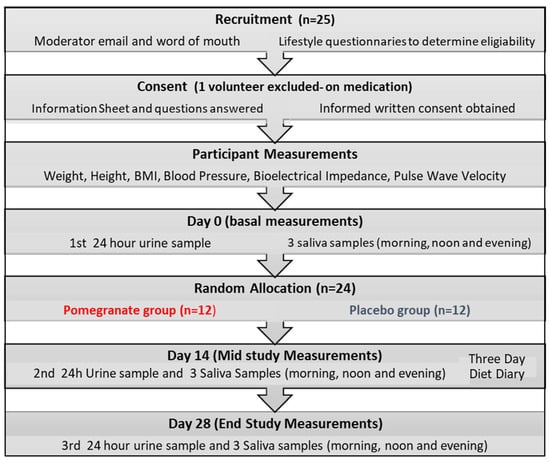 This was a randomized, single-blind, and placebo-controlled study conducted in healthy volunteers. The duration of the study was 28 days. This study was part of a larger trial that has been registered with ClinicalTrials.gov as NCT02005939. Volunteers were recruited through word-of-mouth at Queen Margaret University, Edinburgh, UK, and an e-mail moderator advertisement, which was sent to all students and staff within the university. The study was open to men and women from 18 to 65 years of age, with a body mass index (BMI) between 18 and 34 kg/m2. Individuals with CVD, chronic diseases, hypertension or receiving anti-hypertensive medication or any other regular drug treatment, type 2 diabetes mellitus, asthma, thyroid diseases, and eating disorders were excluded. Pregnant and breastfeeding women, subjects with allergy to pomegranate and those taking supplements that may interfere with the study products were also excluded. Participants were asked to refrain from sterenous extercise and alcohol consumption at least 24 h prior to all 3 study visits. The study protocol was approved by the Institutional Review Board of Queen Margaret University (code13000065/Master DM009/Pomegranate extract/DNBS/QMU) and written informed consent was obtained from all participants. All data were anonimyzed, coded and securely stored on a password-protected database.