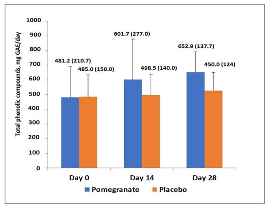 As shown in Figure 2, in the PE group, urinary excretion of total phenolic compounds showed a significant increase at days 14 and 28, from a mean of 481 ± 210.7 to 601.7 ± 277.0 mg/GAE/day (p < 0.02) and to 652.9 ± 137.7 mg GAE/day (p = 0.02), respectively. Changes of total phenolic compounds in the placebo group were not significant. The increase in total phenols in the PE group at day 28 compared with the placebo was significant (p = 0.05).