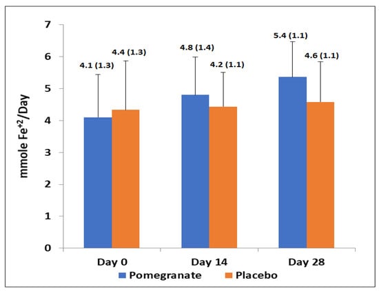 Antioxidant capacity of urine samples from 0–28 days in both study groups. In the pomegranate group, increases from day 0 to day 14 (p = 0.01) and day 28 (p = 0.02) were significant. Between groups, FRAP increase in the PE group at day 28 was significant, p = 0.05).