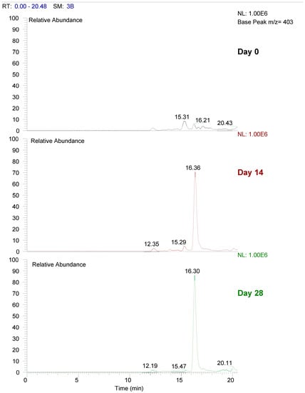 Bioavailability of urolithin A glucuronide in urine samples of one participant assigned to the PE group, at baseline and at days 14 and 28 after consumption of PE.