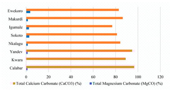In Nigeria, limestone and marble are the main minerals of cement production. The conversion of this limestone into cement by heat releases carbon dioxide as a waste product. Ndefo [] highlighted the deposits of these minerals and their carbon contents in various percentages, as shown in Figure 1. They are mainly composed of the carbonates of calcium and magnesium. Large deposits of calcium carbonate (CaCO3) are observed in Calabar, Yandev, and Ukpilla, with Ewekoro having the largest deposit of Magnesium carbonate MgCO. The Nigerian Ministry of Mines and Steel Development reports a total limestone collection of approximately 2.3 TMT, of which 568 MMT stands as proven reserve and 11 MMT is used. Such deposits are endowed unadulterated, mainly across Ebonyi, Cross-River, and Benue cities with large industrial volumes among Gombe, Edo, Sokoto, and Ogun. Nonetheless, the largest enriched West African nation is Nigeria.