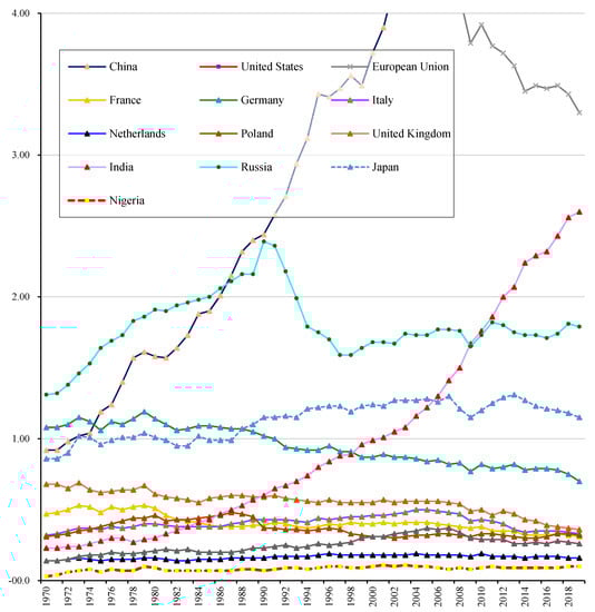 The manufacturing sector and agricultural sector have contributed significantly to the Nigerian Gross National Product. The active role of these sectors makes it evident that even a minor climate deterioration can cause harmful socioeconomic consequences. In the cement industry, policies to reduce the combustion of fossil fuels like carbon and to adopt renewable energy sources have only been successful at the paper stage as there is poor or no acceptance of these methods. Nigeria is the biggest cement manufacturer across West Africa, with increasing production demands. Its cement production utilizes a large volume of unprocessed input and combustibles (biodiesel, crude oil, gasoline, coal, among other factory wastage) and thermal and electrical power for its production [,,], playing a major role in environmental variations and global warming as a result of its raw material use and processing []. Although cement production causes noise pollution, which is detrimental to man’s health, the main environmental issue associated with its production is the formation of heavy metals as seen in wastewater and solid waste such as carbon-dioxide (CO2) emission, VOCs, fly ash, dust, and particulate matters (PMs) []. Sadly, solutions for the climate change and global warming challenges do not yield intense renowned impact since they are far too complex for political discussions. The looming effects of climate variabilities now threaten stable food supply in some regions of the country. In the arid zones of northern Nigeria, droughts are getting worse, and the southern part is getting wetter with growing climate uncertainty. A major influence of weather changes and global warming is weather unpredictability. This is so conspicuous as some areas in Lagos and Ogun State were said to have experienced an uncommon rainfall with thunderstorms in the early days of 2021, drawing attention to the fact that these regions record the highest number of industries in Nigeria. The challenge of climate unpredictability makes subsistence farming difficult []. Research has shown that the leading cause of environmental disruptions is the continuously rising CO2 levels from emitting biomass, concrete production, and desertification, which are the major causes of CO2. As of 2020, the current trend of CO2 emission in Nigeria from cement production is still on the rise. As presented in Figure 3, carbon-dioxide (CO2) emissions in Nigeria have been growing steadily from 1970 to date. The earth’s CO2 level will keep escalating owing to high demand for concrete (cement production), incessantly combusting fossil fuels, land-use adaptations, and particularly deforestation.