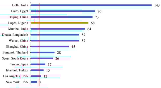 Annual mean concentration of PM2.5 (µg/m3) in various cities [].