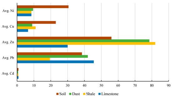 Abimbola et al. (2007) [] evaluated past hospital documentations and the present well-being of locals and revealed the increasing contagion of sickness connected to huge alloy fatality, generated by cement dust from factories, posing a threat to future habitation. The research considered the quantities of selected heavy metals in Figure 6 as: soils [Ni (13.0–17 ppm), Cd (0.5–1.1 ppm), Zn (43–69 ppm), Cu (22–35 ppm), Pb (28–49 ppm)], shale [Cu (2.0–11 ppm), Pb (17–22 ppm), Cd (0.3–1.1 ppm), Ni (3.0–18 ppm), dusts [Cd (0.5–0.7 ppm), Zn (17–147 ppm)], Cu (2–16 ppm), Pb (32–52 ppm), Ni (2–17 ppm)], Zn (5–152 ppm), limestone [Cu (3.0–11 ppm), Ni (3.0–8.0 ppm), Cd (n.d.-1.7 ppm), Zn (7.0–53 ppm), and Pb (42–48 ppm)].