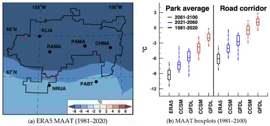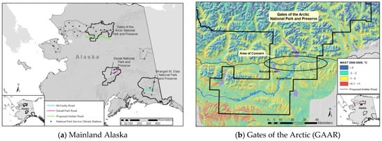 The authors confirm that all data used in this study are publicly available. The hourly and daily station data for GAAR, DENA, WRST are available from: NOAA NCEI GHCN-D (https://www.ncei.noaa.gov/products/land-based-station/global-historical-climatology-network-daily, accessed on 16 August 2022; [29]), the NPS Arctic Network (https://irma.nps.gov/DataStore/Reference/Profile/2279038, accessed on 16 August 2022; [30]), the NPS Central Alaska Network (https://irma.nps.gov/DataStore/Reference/Profile/2279039, accessed on 16 August 2022; [31]), and the Western Regional Climate Center Fire Remote Automatic Weather Stations (FIRE; https://wrcc.dri.edu/wraws/akF.html, accessed on 16 August 2022; [32]). The shapefiles containing Denali Park Road and McCarthy Road are available from https://dot.alaska.gov/stwddes/gis/shapefiles.shtml (accessed on 29 July 2022) and for the proposed Ambler Road from https://eplanning.blm.gov/eplanning-ui/project/57323/590 (accessed on 29 July 2022). The hourly ERA5 reanalysis products are available from https://cds.climate.copernicus.ecdsapp#!/home (accessed on 29 July 2022) and the 20 km downscaled climate model data from NCAR CCSM4 and GFDL-CM3 from https://registry.opendata.aws/wrf-alaska-snap/ (accessed on 29 July 2022).