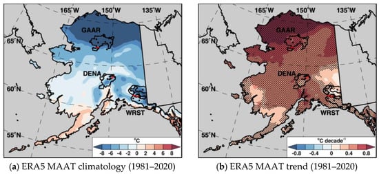 Hourly and daily near-surface air temperature and precipitation data from 18 stations in or close to Gates of the Arctic, Denali and Wrangell-St. Elias were retrieved from the NOAA National Centers for Environmental Information (NCEI) Global Historical Climatology Network Daily database (GHCN-D; https://www.ncei.noaa.gov/products/land-based-station/global-historical-climatology-network-daily, accessed on 16 August 2022; [29]), the NPS Arctic Network (ARCN; https://irma.nps.gov/DataStore/Reference/Profile/2279038, accessed on 16 August 2022; [30]), the NPS Central Alaska Network (CAKN; https://irma.nps.gov/DataStore/Reference/Profile/2279039, accessed on 16 August 2022; [31]), and the Western Regional Climate Center Fire Remote Automatic Weather Stations (FIRE; https://wrcc.dri.edu/wraws/akF.html, accessed on 16 August 2022; [32]). The hourly data were aggregated into daily values, and a maximum threshold of allowable missing values of five percent from the total number of possible values was used for both the hourly and daily data. The climate indicators, MAAT and JJA PCPT, were then calculated for each available year. Table 1 provides information for each of these stations, including location, elevation, beginning year of available record and the number of valid years for observed MAAT and JJA PCPT.