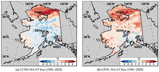 The CCSM and GFDL were dynamically downscaled for Alaska to 20 km × 20 km spatial resolution (https://registry.opendata.aws/wrf-alaska-snap/, accessed on 29 July 2022) using the Advanced Research core of the Weather Research and Forecasting Model, v3 (WRF; [44]). A description of the WRF model configuration used, including the physics options and model spin-up, can be found in Bieniek et al. [45], which describes the same process that was used to downscale ERA-Interim to 20 km. The 31 km ERA5 data were interpolated to the 20 km downscaled grid using the patch method from the NCAR Command Language’s (NCL) Earth System Modeling Framework (ESMF) software, from NCL v6.4.0 [46]. This was done to allow for direct comparison between the gridded datasets. Similar to ERA5, hourly output from the WRF downscaling was aggregated to produce the MAAT and JJA PCPT climate indicators.
