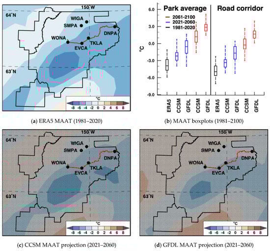 Denali National Park (a) ERA5 mean annual air temperature (MAAT) climatology (°C), (b) park-average (left) and road corridor (right) boxplots of MAAT, and bias-corrected: mid-century MAAT projections from (c) CCSM and (d) GFDL and late-century MAAT projections from (e) CCSM and (f) GFDL. All projections are significant at the 95% confidence level (shaded with stippling).