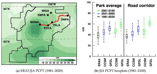 Gates of the Arctic (a) ERA5 summer precipitation (JJA PCPT) climatology (cm), (b) park-average (left) and road corridor (right) boxplots of MAAT, and bias-corrected: mid-century MAAT projections from (c) CCSM and (d) GFDL and late-century MAAT projections from (e) CCSM and (f) GFDL. Projected changes at the 95% confidence level are shaded with stippling.
