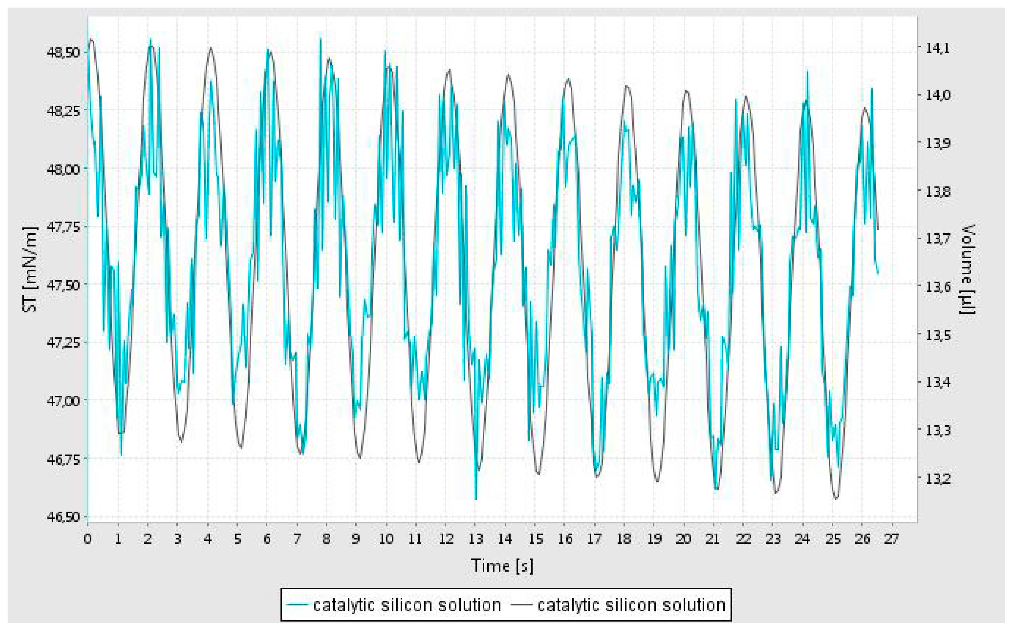 Variation of pendant drop volume (smooth curve) and the computed surface tension (irregular curve) of the silica support precursor dispersion (Bindzil CC30) as a function of time for the measurement of surface rheology.
