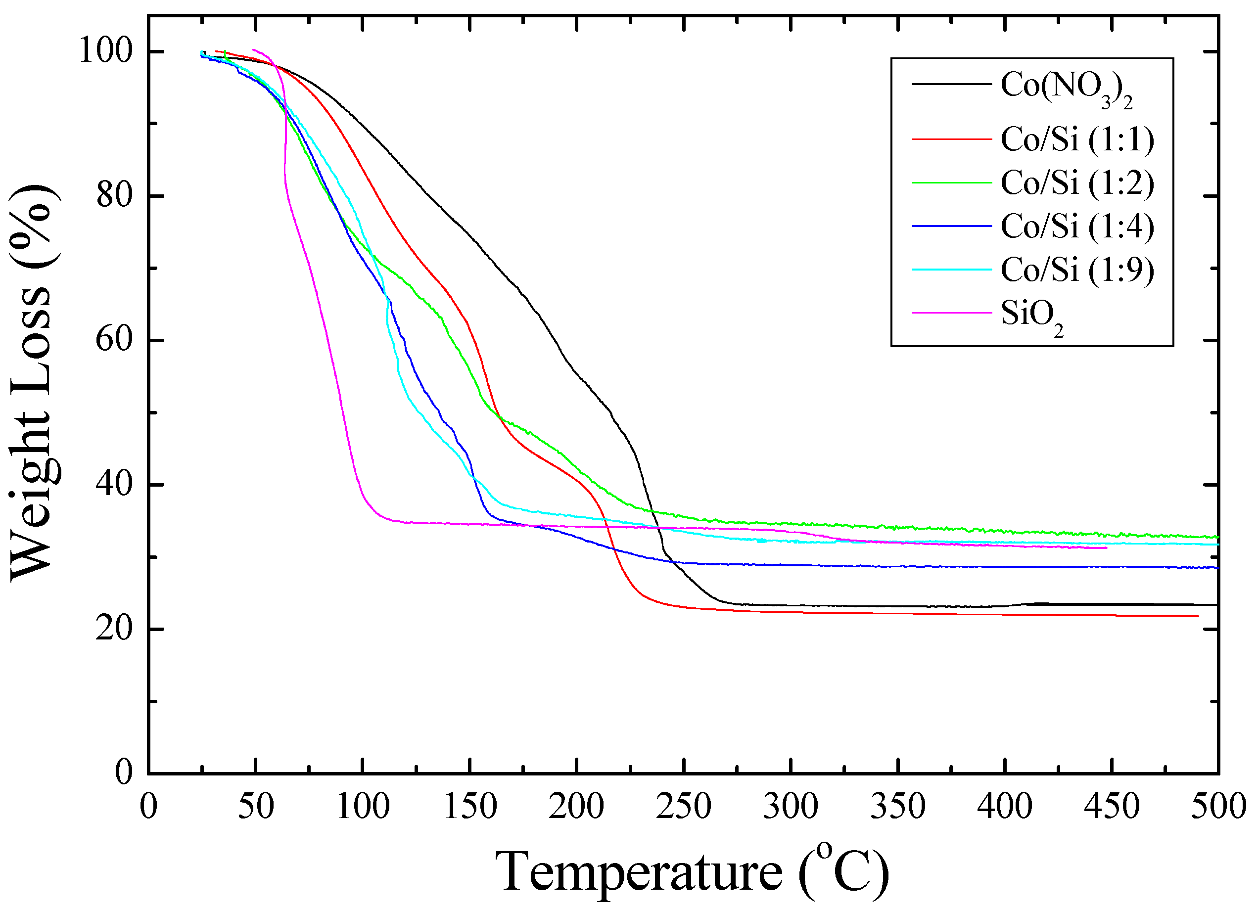 The results from the thermogravimetric analyzer are shown in Figure 2 which indicates the rapid water loss from silica dispersion while the weight loss from cobalt nitrate solution is the slowest, although at about 220 °C, the rate of weight loss is fastest which corresponds to the decomposition of Co(NO3)2. In the case of silica containing Co(NO3)2 solutions ([Co]/[Si] = 1, 1/2; 1/4; 1/9) there are several weight loss steps indicating the formation distinct hydrates and structures. Furthermore, at low temperatures (<50 °C) the weight loss is faster than silica dispersion ([Co]/[Si] = 0).