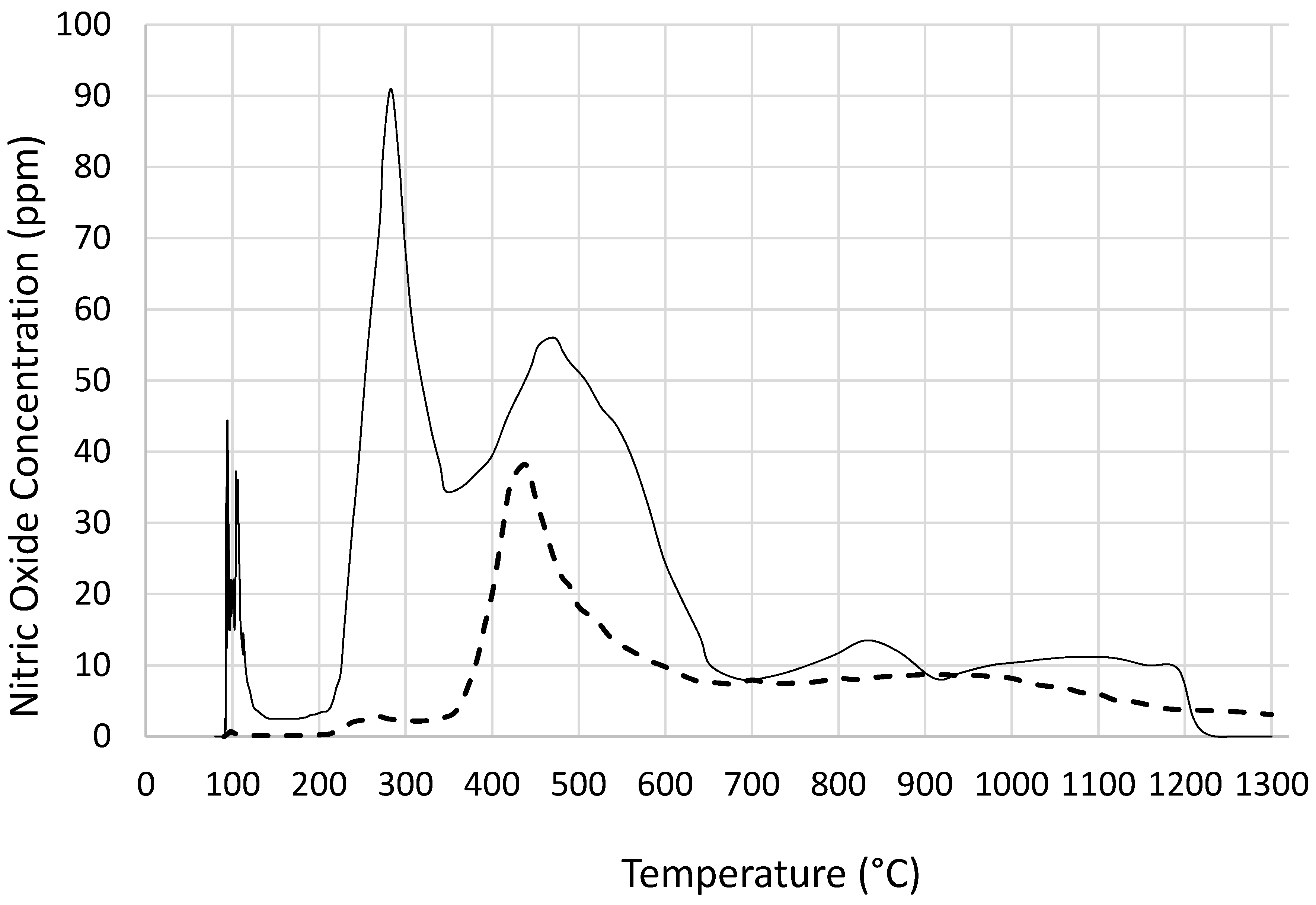 Temperature programmed pyrolysis of cobalt nitrate when: - - - [Si] = 0 and – [Si]/[Co] = 4. Variation of nitric oxide concentration (ppm) with temperature.