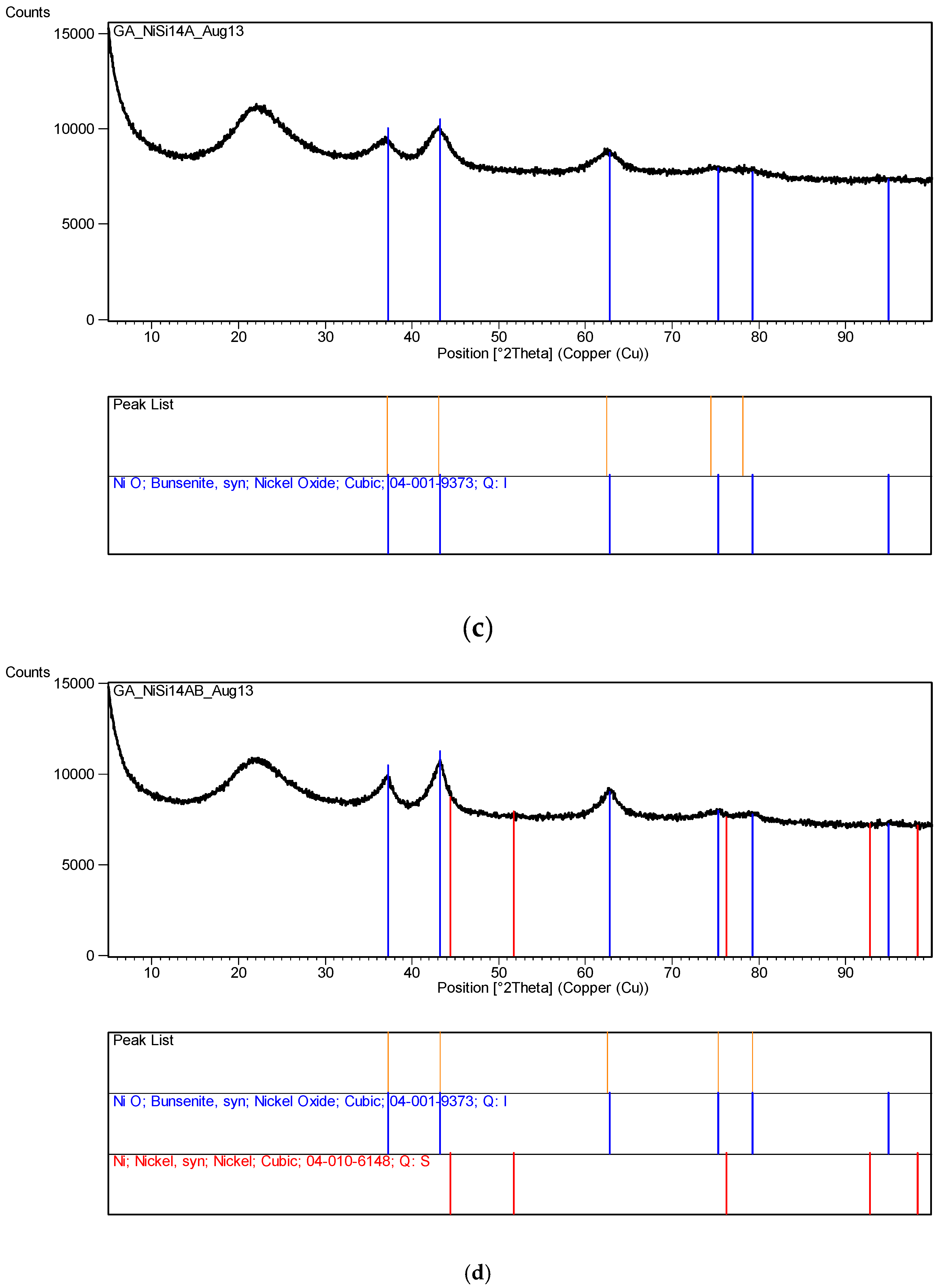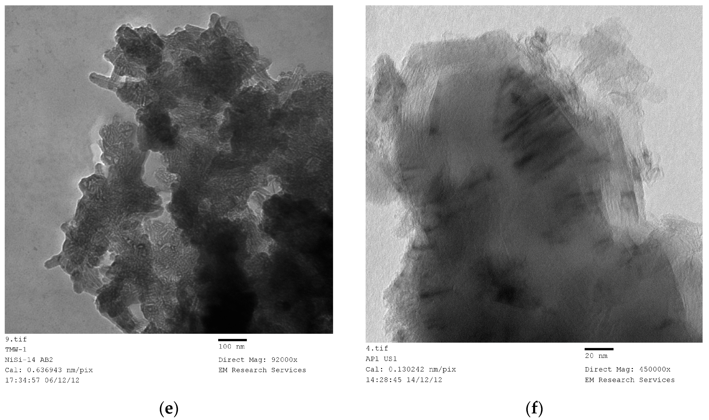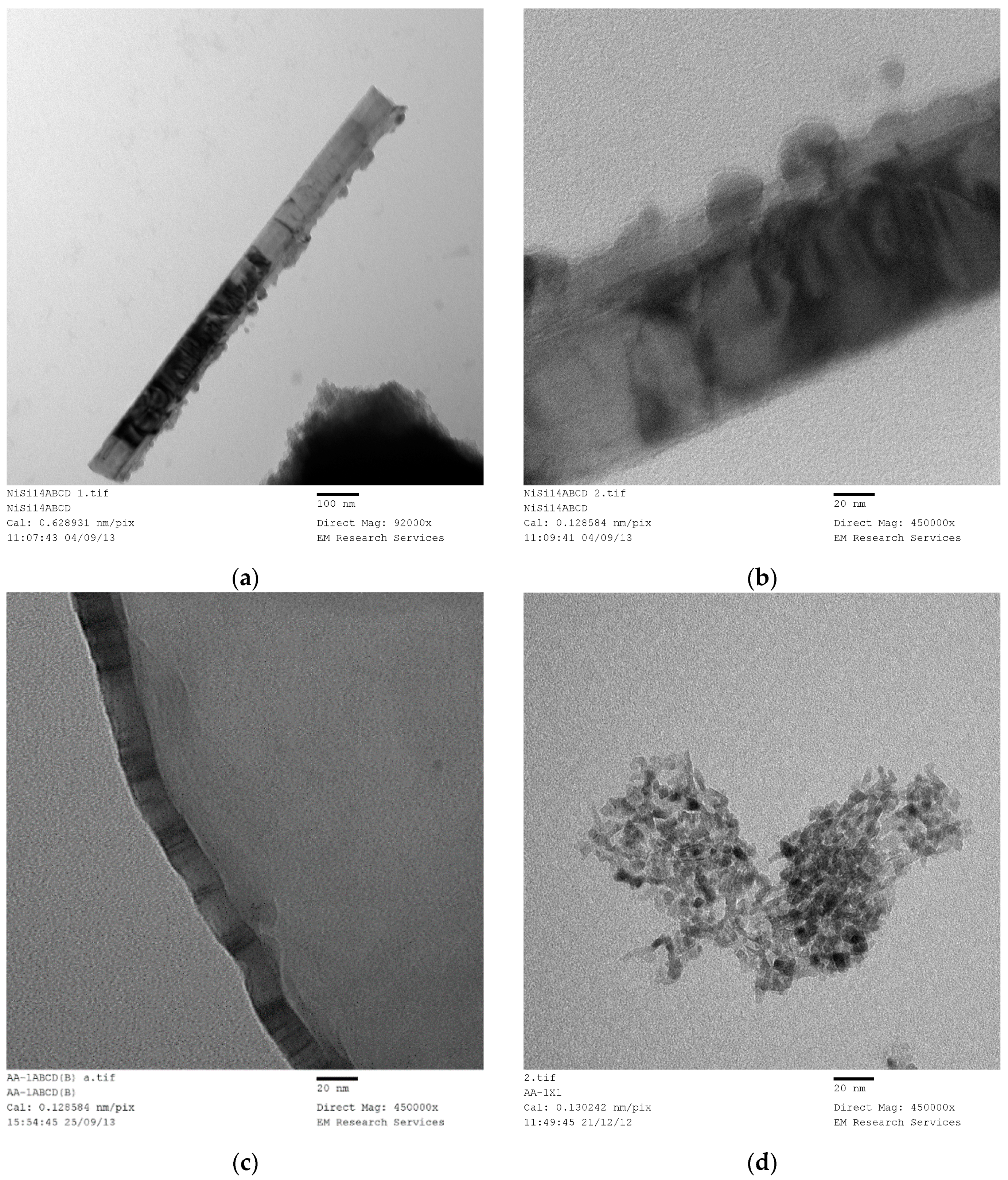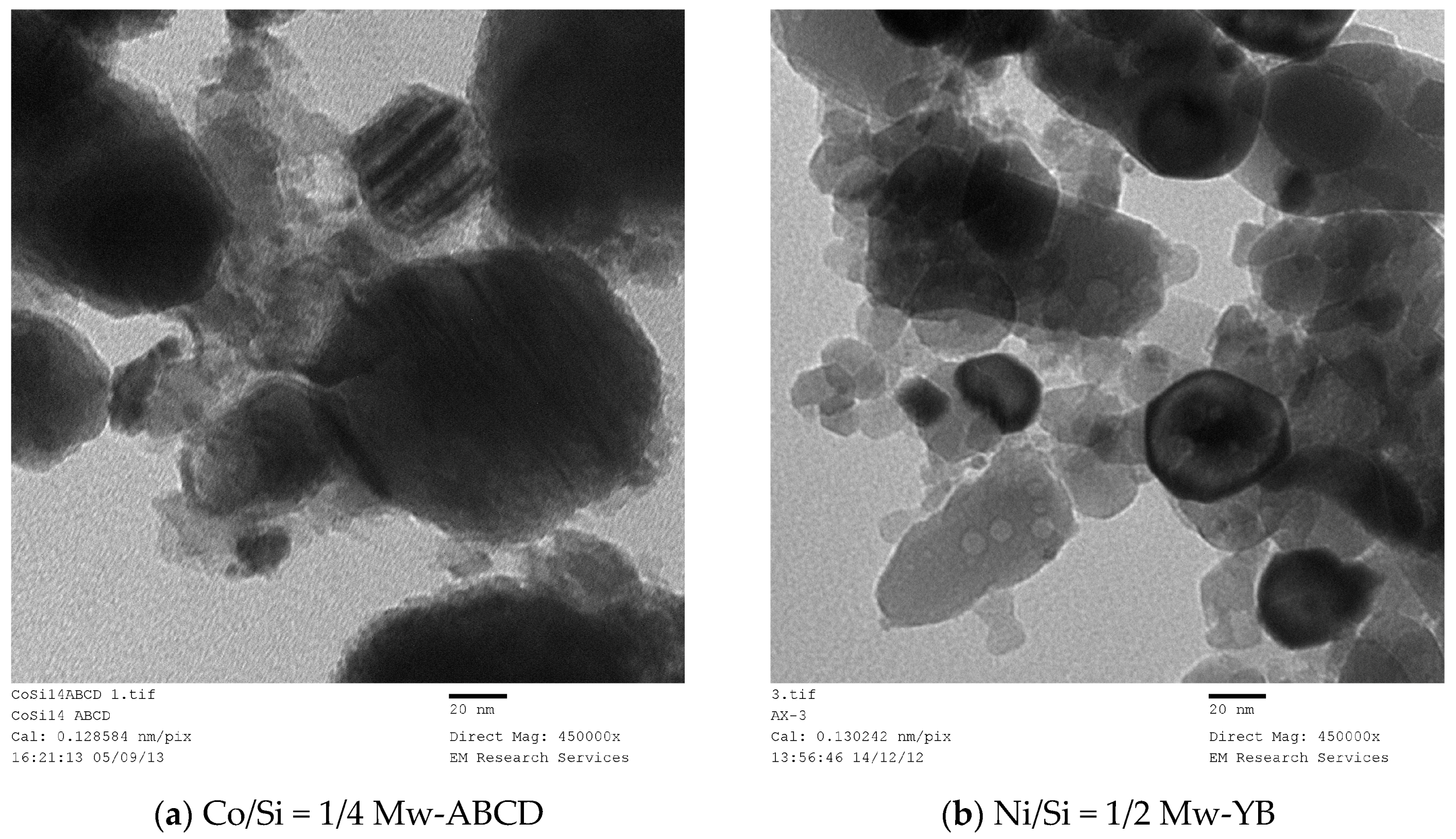 Therefore, a catalyst sample described as Ni/Si = 1/4 Mw-ABCD means that the catalyst (Ni) and support (SiO2) molar ratio was 1/4. Catalyst/support precursor fluid was microwaved at 1 kW. It formed a NiO which was then heat treated using the Method-C (Section 3.8) for 2 h followed by slow cooling in the furnace for 24 h. The resulting catalyst oxide was then reduced at 550 °C and used in a reaction.