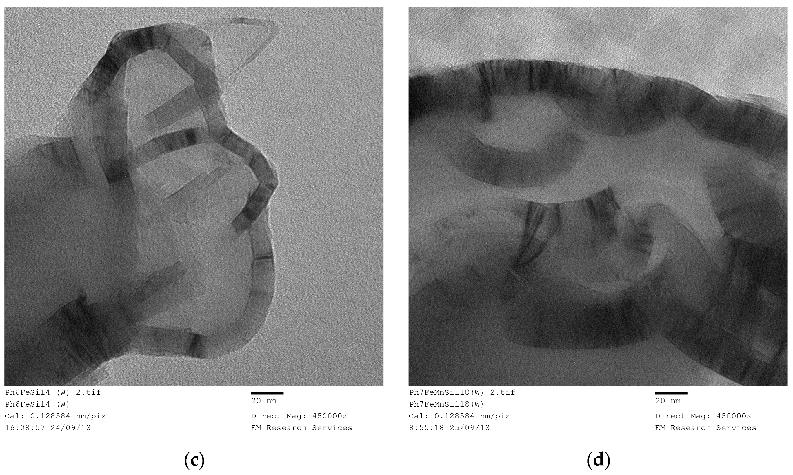 The walls in the form of ribbons have a surface skin layer of silica with thickness ca. 2 nm as seen from Figure 22c,f and Figure 23b. However, there is no evidence of the presence of the 7 nm silica particles anywhere in the TEM images of the silica systems investigated. In fact, these particles were conspicuously absent on the walls of the ellipsoidal bubbles or between the catalyst strips/planes forming the bar-code appearance in the ribbon structures. Spherical silica particles only appear occasionally (Figure 24b), but their size is often below 7 nm. The absence of the original catalyst support particles and formation of planar bar-code structures with catalyst/silica separation as low as 0.6 nm should be explained in the mechanism of present catalyst preparation technique.