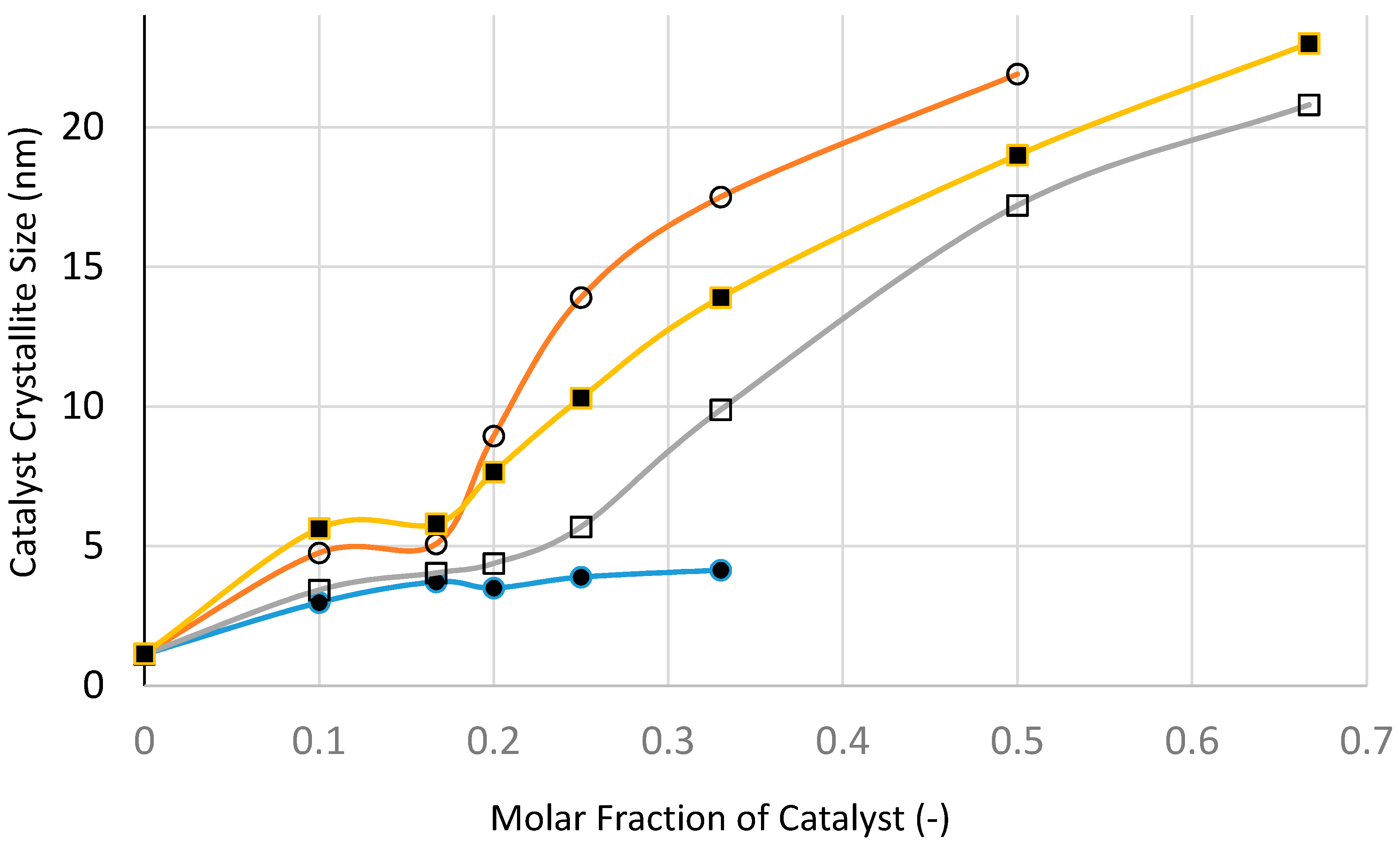 The effect of catalyst loading on the XRD-based catalyst size of the supported nickel catalyst system before reduction with hydrogen after the formation of NiO. (●)—Microwave radiation at 1 kW (Stage-1a); (○)—Thermal processing at 300 °C with slow heating and slow cooling using Method-A, Section 3.8 (Stage-1b); (□)—Thermal processing at 600 °C with fast heating and fast cooling using Method-B, Section 3.8 (Stage-1c); (■)—Thermal processing at 600 °C with slow heating and slow cooling using Method-C, Section 3.8 (Stage-1d).
