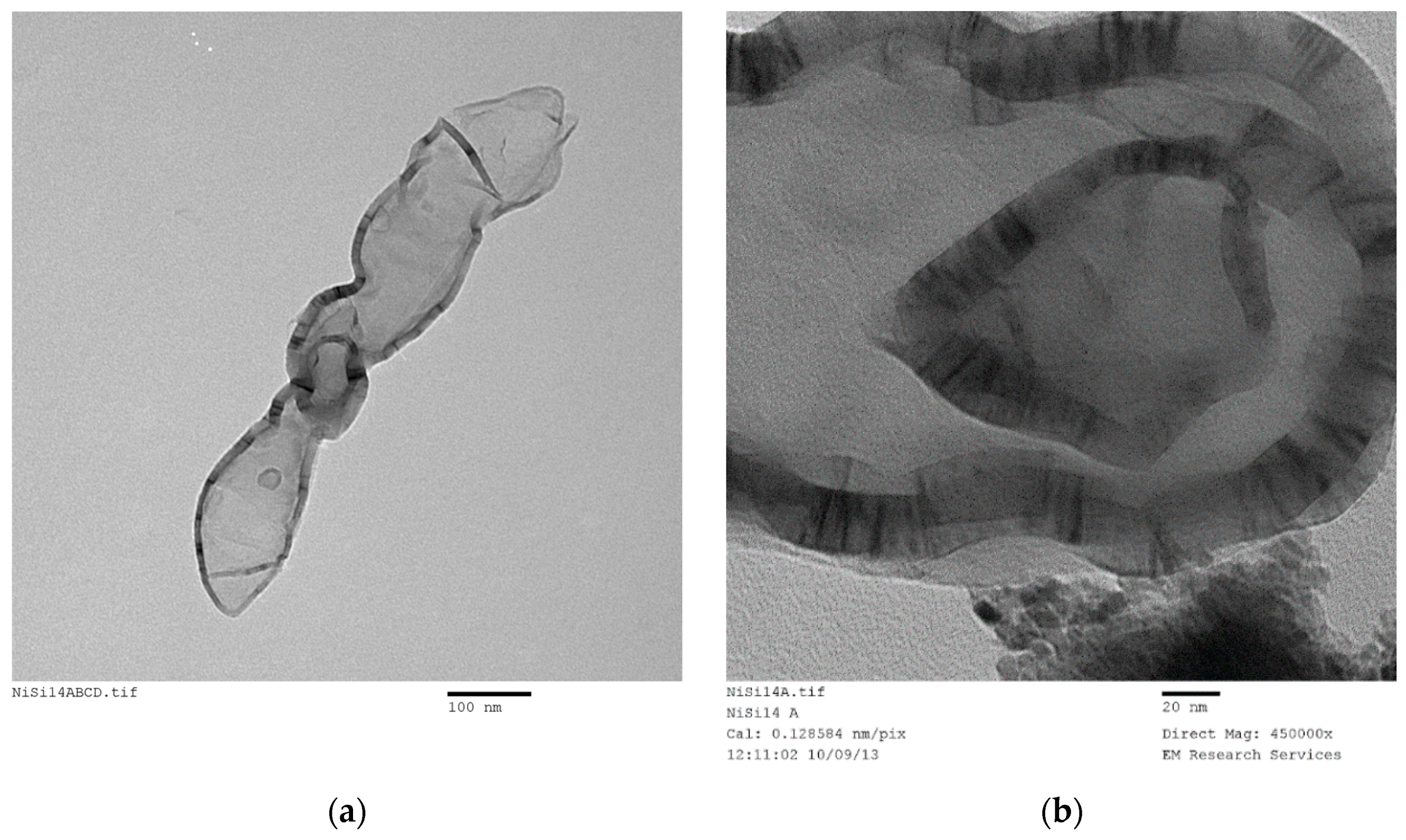 Presence of a complete elongated bubble in Ni/Si precursor fluid formed as a result of silica/nickel interaction during the boiling stage of the precursor fluid. (a) Complete bubble from Ni/Si = 1/4 Mw-ABCD (used in ammonia production). Scale bar = 100 nm; (b) Enlarged view of two bubbles from the catalyst oxide Ni/Si = 1/4 Mw-A. Scale bar = 20 nm.