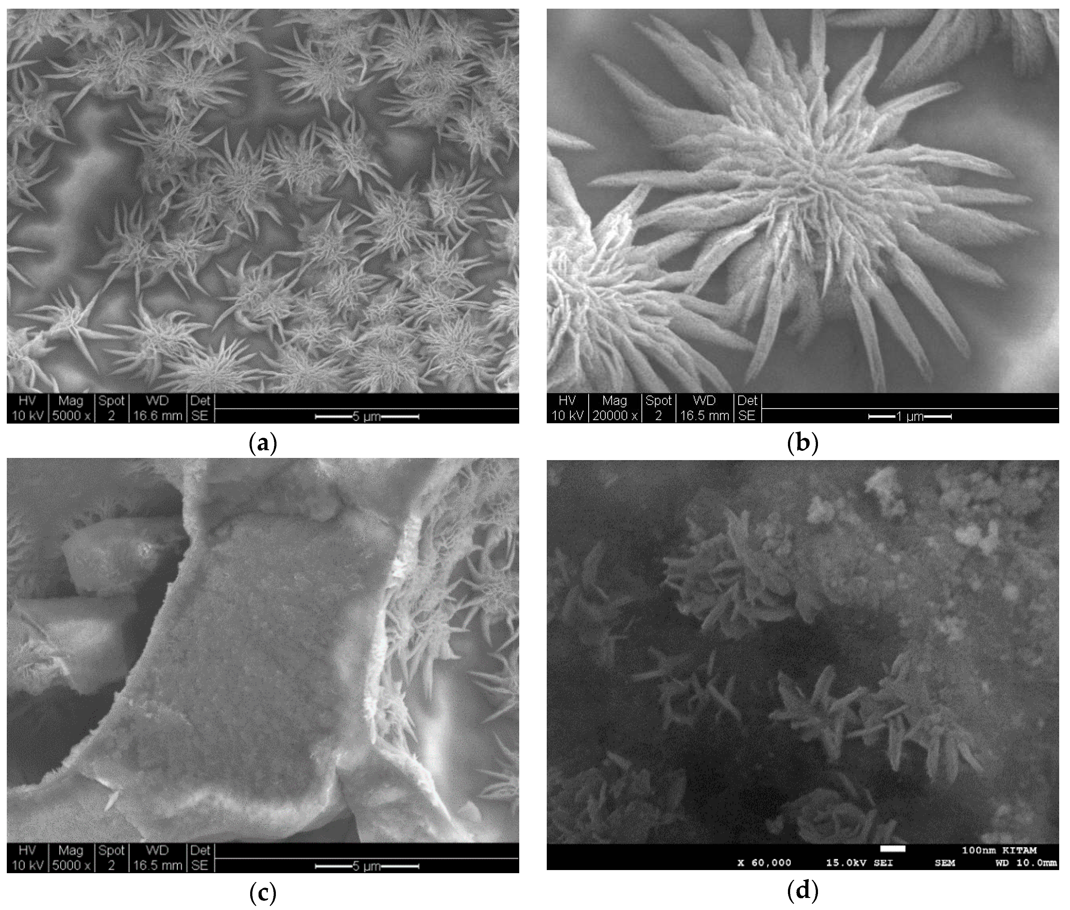 In order to observe the presence of the ribbon structure under SEM, it is however possible to obtain large planar structures grown from the self-associated ribbons. One such system was found to be Co/Cu/Si = 1/1/8 Mw-A system ([Co]/[Cu]/[Si] = 1/1/8 so that ([Co]+[Cu])/[Si] = 1/4). The high magnification SEM images of this sample after microwave irradiation are shown in Figure 28. In this binary catalyst system, there is a separation into Co and Cu rich phases. In these flower-like structures, the atomic composition was Co/Cu/Si = 1/1.44/3.12 as determined by EDX analysis. These flower-like structures are formed from planes with thickness in the range of ca. 50 nm–200 nm, although the large structures are clearly formed from thinner planes. The length of the large planes can be as high as 1 micron. These observations are shown in Figure 28a–c. As seen in Figure 28a,b, the planar structures appear to grow as they emerge from the walls of the catalyst wall which is dominantly silica rich (Figure 28c,d). These flower-structures fade when the binary catalyst is heat treated at 600 °C as in fact shown in Figure 18c.