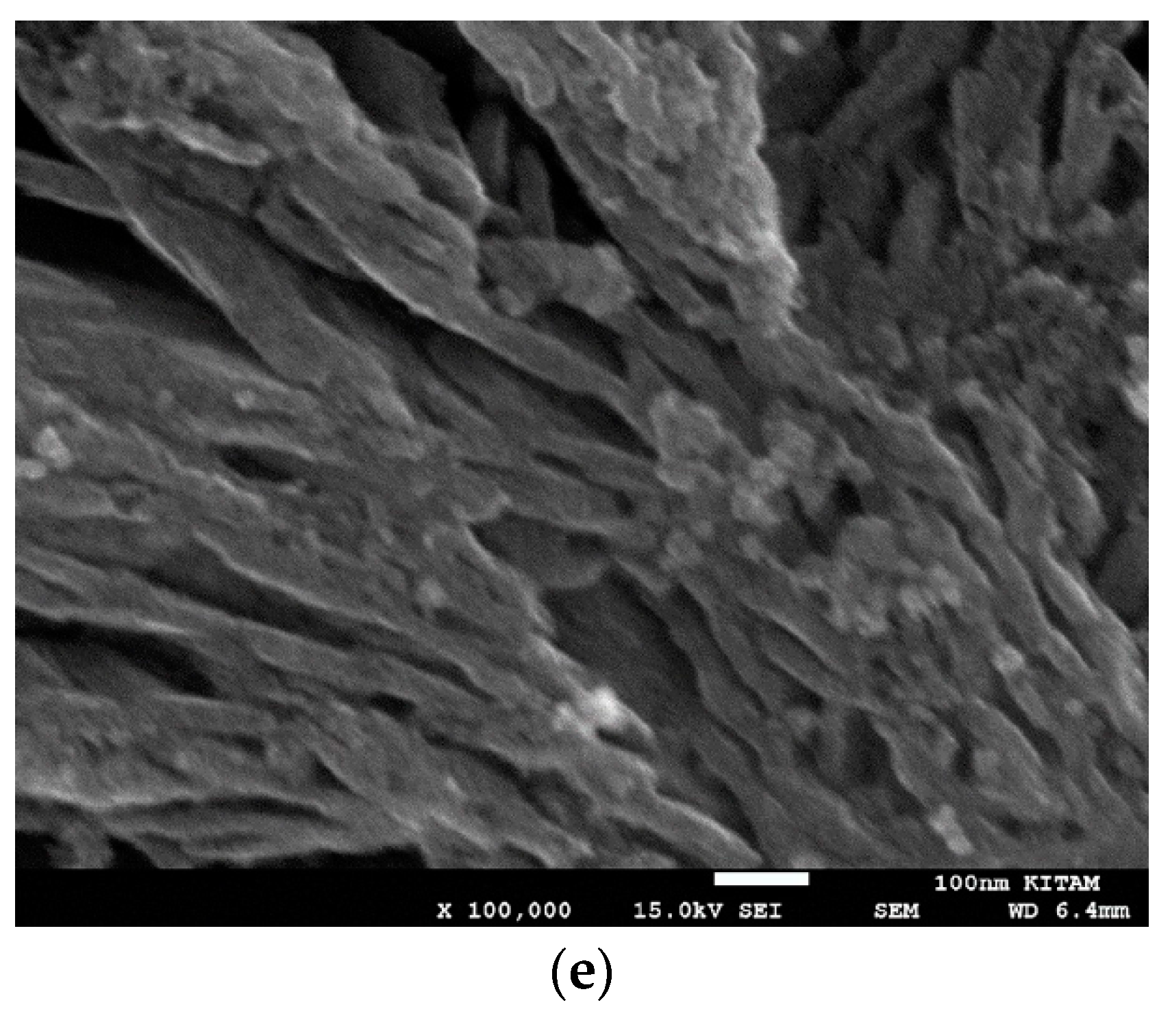 Structure of Co/Cu/Si = 1/1/8 Mw-A binary catalyst system showing the presence of planar aggregates formed at the catalyst/air interface during the microwave irradiation (1 kW) of supported binary catalyst precursor fluid. (a) Wall surface structure (Scale bar = 5 μm); (b) Wall surface structure at higher magnification (Scale bar = 1 μm); (c) Wall cross-section structure (Scale bar = 5 μm); (d) Enlarged view of the wall cross-section structure showing the presence of phase separation in the form of proto-flower structures (Scale bar = 100 nm); (e) Long ribbons of supported catalyst formed from the films/elongated bubbles during boiling of the precursor fluid. These strips are several hundreds of nanometers long and ca. 40 nm wide form a porous wall structure of the catalyst (Scale bar = 100 nm).