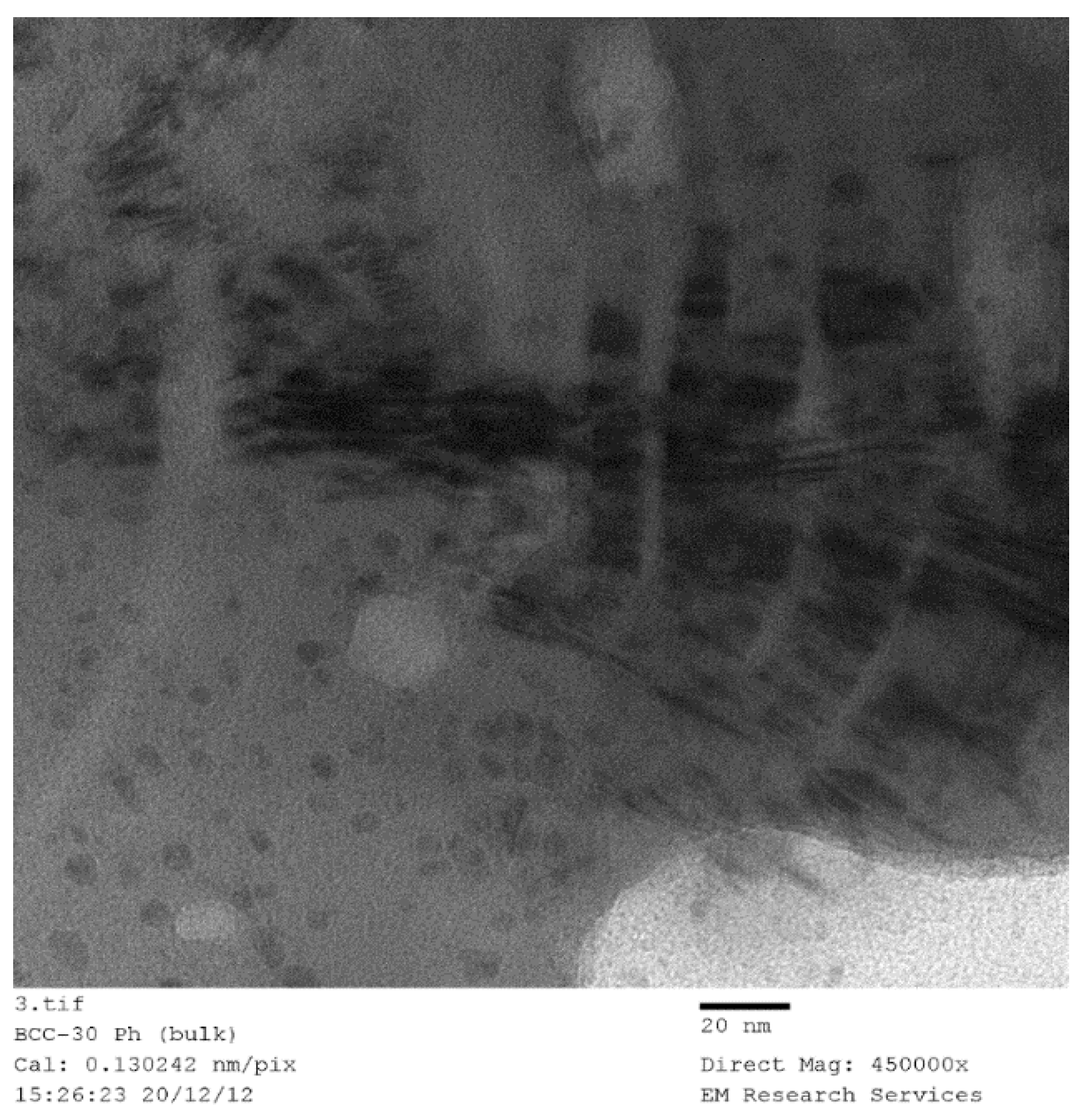 TEM image of the catalyst/support precursor fluid (Fe/Si = 1/4 Ph) after UV-irradiation for 30 h. It shows the de-aggregation of the silica particles and the formation of liquid crystal phases in the form of bar-codes.