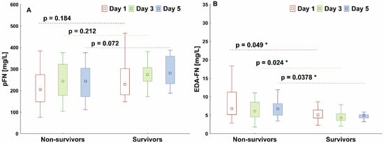 Differences in pFN and EDA-FN between the specified time points (days 1, 3 and 5) were analyzed in each group using a Friedman ANOVA with post-hoc tests. There were no differences between the specified time points for the pFN (Non-survivors: p = 0.157, Survivors: p = 0.442). There were no differences between the specified time points for the EDA-FN in the Non-survivors (p = 0.662), but in the Survivors the EDA-FN concentration decreased significantly (p < 0.05) on days 3 and 5 compared to the baseline.