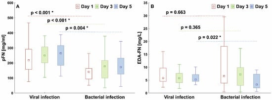 The median pFN concentration in viral infections (COVID-19 patients) was significantly higher than in bacterial infections (septic patients) on each study day, while the median EDA-FN concentration was higher in viral than in bacterial infections only at the end of observation (Figure 2).