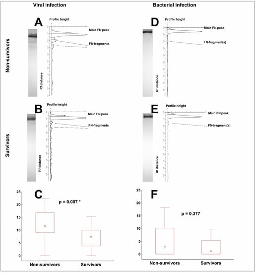 The occurrence of FN-fragments in the plasma of patients with a viral infection (COVID-19, left panel) or a bacterial infection (sepsis, right panel). Representative immuno-patterns of FN and FN-fragments and the corresponding densitograms for Non-survivors (graphs (A,D)) and for Survivors (graphs (B,E). Correspondingly, graphs (C,F) compare the number of FN fragments, expressed as a percentage of all FN forms detected in the electrophoretic pathway between Non-survivors and Survivors. The box plots represent the median values (midpoint) with interquartile range between the 25th and 75th percentiles (box); the whiskers represent the minimum and maximum values. * indicates p-value less than 0.05.