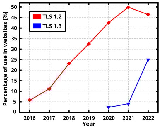 Transport Layer Security (TLS) is the most used protocol for providing end-to-end secure channels in computer networks []. The Internet Engineering Task Force (IETF) released the standard of TLS. Figure 1 illustrates the TLS percentage of use in websites, reporting 79.4% in the first quarter of 2022 [], and showing that TLS 1.2 represents approximately half of the use in websites during this period. In addition, the use of TLS 1.3 increased by 600% in use compared to the last year, demonstrating the importance of the new specification in secure end-to-end communications.