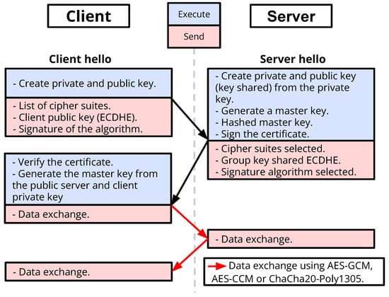 In the previous version of TLS, the RC4–MD5, RC4–SHA, and AES–CBC cipher suites were used []. However, in TLS 1.3, the cipher suites based on RC4 were removed. In addition, the ChaCha20–Poly1305 cipher suite was introduced in the protocol to increase the performance and resistance of side-channel attacks in software implementations. As such, the cipher suites used in the current version of TLS are AES–GCM [,], AES–CCM [,], and ChaCha20–Poly1305 []. Figure 2 shows the handshake protocol in TLS 1.3. First, the client and server interchange the keys and certificates to establish the connection. When the connection is authenticated, the secure channel is created to exchange information using the AEAD cipher suite selected in the handshake. The speed of the channel mostly depends on the bit rate of the AEAD used in the data exchange.