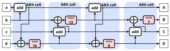 Figure 4 illustrates the QR operation. The inputs a, b, c, and d correspond to one stage in . The QR operation consists of four Add-Rotate-XOR (ARX) cells [,]. The rotate operation highlighted in red is implemented without combinational logic to reduce the delay in the ARX cell, replacing the operation with a wire permutation.