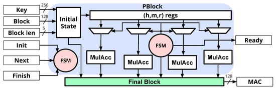 Figure 5 shows the implementation of the Poly1305 core divided into two parts. First, a highlighted in blue generates an initial r and s, using the 256-bit of the . The 128-bit of is then operated using a Multi-Multiplier and Accumulator (MulAcc), reproducing the polynomial described in (3). The MulAcc implementation consists of a 32-bit unsigned multiplier with a 32-bit accumulator. The Poly1305 primitive has four in the architecture, processing the 128-bit of the block in one cycle. The documentation [] determines that the length of the message is arbitrary. As such, the core processes 128 bits in each step. The signal indicates the numbers of bytes in each . Additionally, an FSM highlighted in red controls all of the message to authenticate and the interaction. The signal and indicate the start of the new message process and another of the message, respectively. When the last part of the message is introduced, the signal is triggered to run the end operation. Consequently, the data are pushed to the . Second, the highlighted in green takes the data accumulation and s, generating the MAC. The MAC is obtained by adding the s and the data accumulation generated with each . Furthermore, the result of the sum is truncated into 128 bits. Finally, the signal indicates that the has been generated.