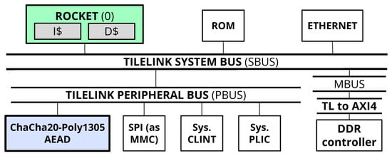 Figure 6 illustrates the overview architecture of the system used to implement the AEAD construction []. The system consists of a Rocket core [], a 4-KB ROM, an SPI, and the different interruption platforms. In addition, the system uses a TileLink protocol for the system (SBUS) and peripheral (PBUS) buses []. The system contains 1 GB of a Double-Data-Rate (DDR) controller. This controller is driven by an Advanced Extensible Interface 4 (AXI4) bus [], converted from the memory-channel bus (MBUS).