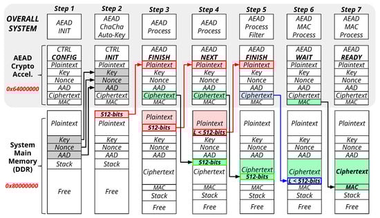 Figure 8 illustrates the functionality of the AEAD peripheral in the RISC-V environment. Steps 1–7 describe the conventional operation with the system memory. The first step defines the initial configuration of the AEAD in decryption or encryption depending on the scenario. In AEAD construction, a one-time key is used in the Poly1305 primitive with two options for creation in the second step. A pseudo-random number generator creates the one-time key. In another way, the ChaCha20 primitive is used with the same key and nonce of the keystream. However, the counter and the plaintext of the ChaCha20 are initialized by zero. The one-time key is the first 255 bits of ciphertext generated for the ChaCha20 primitive. Additionally, the AAD and length in bytes are introduced and processed in the Poly1305 primitive and the accumulator, respectively. One bit in the signal indicates that the AEAD construction is ready for the next block when the block is processed. Furthermore, the last block of the AAD is indicated with one bit in the signal in the peripheral. Steps 3–5 describe the AEAD process to generate the ciphertext or plaintext in the encryption or decryption mode of the implementation. The mode of the AEAD implementation is defined in the signal in the peripheral. The counter of the ChaCha20 primitive starts in one of the first blocks processed, and the plaintext length is necessary per each block introduced. When the final block of the plaintext is not a multiple of 512 bits, the peripheral filter of the response of the ChaCha20 eliminates the extra bits generated in the rounds of the primitive. In each result of the ChaCha20 primitive, the results are introduced in the Poly1305 primitive in blocks of 128 bits. Step 6 introduces the final block in the Poly1305 primitive. The final block consists of the result of the accumulator in the peripheral. When the first part is the length of the ADD, and the second part is the length of the plaintext blocks. Finally, the is generated in step 7.