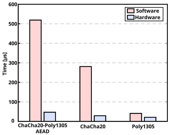 Figure 9 illustrates the performance comparison between the software and hardware implementations. The performance of the ChaCha20, Poly1305, and AEAD hardware implementations increased by 968%, 195%, and 1104% compared to the software implementation. The software implementation runs in an RISC-V environment using one rocket core []. The AEAD implementation result is compared in encryption mode with 16 bytes of AAD.