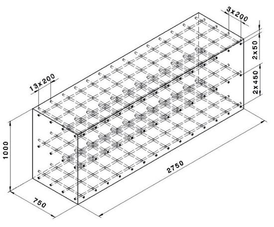As a target for the simulation, a concrete block with steel reinforcement was used. The block had the dimensions of 2750 × 1000 × 750 mm (width × height × depth) with three layers of steel reinforcement that had a diameter of 20 mm. The target geometry can be seen in Figure 2.