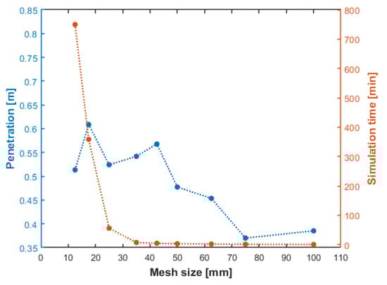 The target in Figure 2 is a half model, as symmetry was applied to it to keep the simulative effort at a computationally lower cost. After conducting a mesh convergence study using the maximal penetration depth of the projectile tip, as Figure 3 shows, a mesh size of 35 mm was chosen to conduct all of the simulations. For the convergence study, an AoA of 45° with a tip angle of 35° was used, and a maximal penetration after 0.01 s has been reported. According to Figure 3, a mesh size of 35 mm provides an optimal relationship between the simulation time and penetration. Additionally, it is evident that changing the element size from 75 mm to 40 mm changed the results by 57%, while element sizes below 40 mm had a maximum of 9% difference; which is in the range of normal fluctuations of an Explicit FEA solver. Furthermore, an element size of 35 mm led to a simulation time for one case of 7.35 min, which is reasonable for the number of simulations performed.