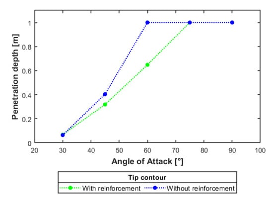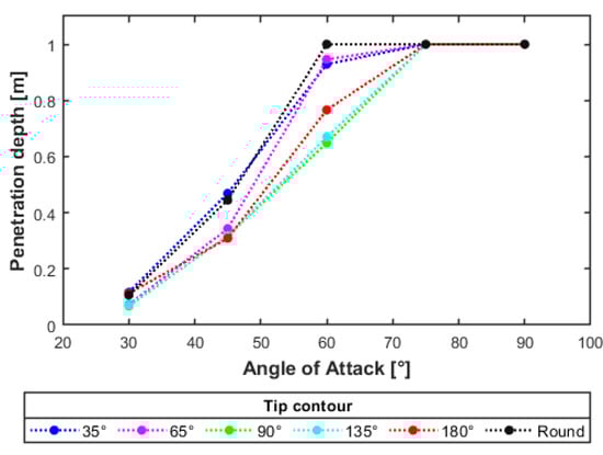 Figure 4 illustrates the penetration over the AoA of the projectile tip for the different tip contours. As evident, a value for the penetration of 1 m (1000 mm) is equivalent to reaching that depth or to penetrating all the way through the target, as the height/thickness of the target is 1 m. What becomes clear is that the steeper the AoA, the deeper the penetration, independent of the tip contour.