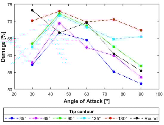 In Figure 6, the percent of damage of the concrete part of the target for the different tip contours over a variation of AoA can be seen.