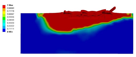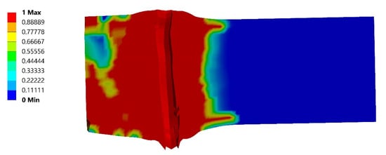 The reported damage in the results is only for the concrete part of the target, and is based on the RHT concrete failure model. The RHT concrete failure model has the capability of pressure hardening, strain hardening, strain rate hardening, third invariant dependence of compressive and tensile meridians, damage effects (strain softening), and crack softening associated with brittle materials []. The factors that influenced the penetration of the projectile in the RHT model are the pressure and strain rate in compression. The damage of the material was determined through the factor D, which can be seen in Equation (1).