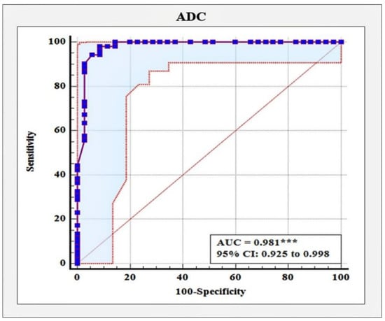 The analysis with the receiver operating characteristic (ROC) curve determined ADC ≤ 1.11 ×10−3 mm2/s as the optimum cut-off value distinguishing malignant from benign tumors with a sensitivity of 94.23%, a specificity of 94.29%, and a very high diagnostic accuracy of 98% (AUC = 0.981, 95%CI: 0.928 to 0.998, p < 0.001) (Figure 2).