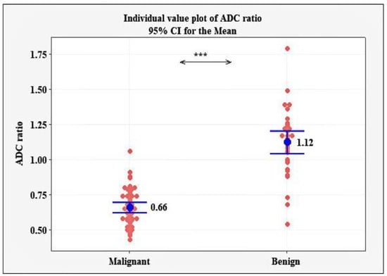 Individual and mean ADC ratio for the patients with malignant and benign tumors, *** p < 0.001.