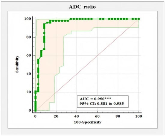 Receiver operating characteristic curve for distinguishing malignant from benign tumors based on ADC ratio, ***p < 0.001.