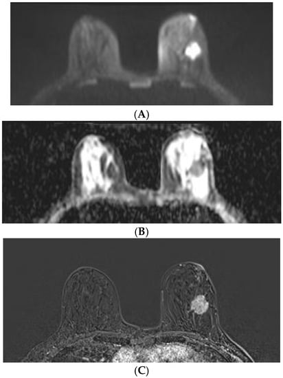Breast MRI in a 45-year-old patient with invasive ductal carcinoma: (A) DWI (b = 800 mm2/s); (B) ADC value 0.60 × 10−3 mm2/s; and (C) DCE-MRI (subtraction image).