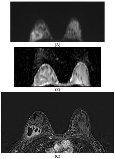 Diffusion-weighted imaging (DWI) is a fast non-contrast MRI technique based on the free movement of water molecules in the extracellular space and reflects tissue cellularity. The motion of water molecules is more restricted in tissues with high cellularity and less restricted in areas of low cellularity [,]. Based on this characteristic, DWI can create contrast images that differ from the conventional T1- and T2-weighted images. Signal intensity in diffusion-weighted imaging is inversely proportional to the degree of water molecule diffusion [], which means that structures with high cellularity and restriction in diffusion will present with a more intense signal. Furthermore, DWI allows the quantitative evaluation of water diffusion, using the apparent diffusion coefficient (ADC). Its value is calculated in square millimeters per second (mm2/s) and can be measured by assessing the signal attenuation that occurs at diffusion-weighted imaging performed with at least two different b values []. Breast cancer usually presents with a restricted diffusion of water molecules which leads to increased DWI signal. The ADC value is lower as compared to normal breast tissue and benign lesions of the breast [,]. High ADC values are rarely reported in malignant lesions [,]. Some authors additionally used the ADC ratio between the ADC value of the lesion and ADC value of normal breast glandular tissue to further evaluate the diagnostic performance of DWI [,].