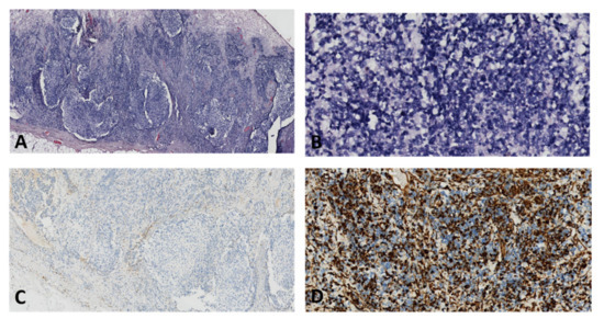 Dysgerminomas are composed of a monotonous cell population. The cells resemble primordial germ cells that grow in islands [25]. Tumor cells have a round or polygonal shape, their cytoplasm stains pale to eosinophilic and have discrete cell membranes, which are surrounded by connective tissue containing lymphocytes, mainly T-cell lymphocytes (Figure 3) [26]. The nuclei are large, rounded, and typically central or slightly eccentric, and they might contain one or a few prominent nucleoli. Some variations of the size of the cells and of the nuclei is usually seen and about 5% of dysgerminomas contain syncytiotrophoblastic giant cells, which may result in an elevated serum β-hCG level [27]. Mitotic figures are frequently seen and may vary from slight to brisk. Necrosis and hemorrhage are common [26]. Atrophic calcification is seen in some tumors in association with necrosis, hemorrhage, fibrosis, or hyaline degeneration. Sometimes microcalcifications, when present in dysgerminomas, suggest an underlying gonadoblastoma. Dysgerminoma is seen as a pure disease, nevertheless in some cases it be associated with other germ cell tumors [28]. On immunohistochemistry, the cells are strongly positive for PLAP, CD117/c-kit, OCT4, and D2-40. PLAP is not a useful marker to differentiate dysgerminoma from other malignant germ cell neoplasms since PLAP can also stain other malignant germ cell tumors, but it is a valuable marker differentiating dysgerminoma from non-germ cell malignancies. CD117/C-kit expression is not specific for dysgerminoma; it can also be seen in the solid variant of yolk sac tumors. Diffuse strong nuclear staining for OCT4 is characteristic of dysgerminoma but is also expressed in embryonal carcinoma. SALL4 is a highly sensitive marker for primitive germ cell tumors which can also show positivity in embryonal carcinoma, yolk sac tumor, and primitive areas of immature teratoma [26,29].