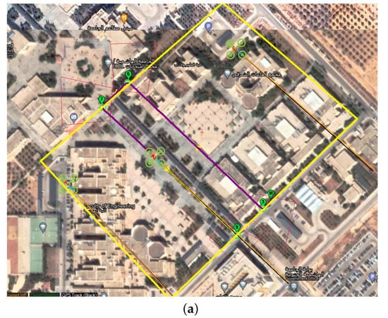 Surveying mission at the campus of the Hashemite University: (a) a photo from the drone’s camera and (b) planned automatic mission on a map using sequence of way-points.