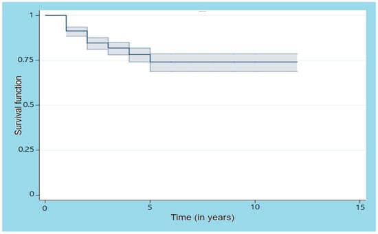 The Kaplan–Meir estimation of the overall survival function (Figure 1) at the end of the study time is , or equivalently, the rate of death at the end of the study time is . The time is in years with origin fixed in 2009.