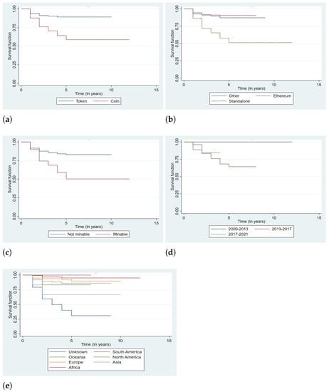 Figure 2a suggests that the survival outcome is significantly better for tokens as compared to coins . Figure 2b indicates a relatively better survival outcome for cryptocurrencies under Ethereum . Figure 2d suggests a significant high risk as a cryptocurrency is minable . Among the levels of the variable Series, cryptocurrencies released in the series 2009–2013 present significantly better survival outcomes as Figure 2d indicates, this is the same for South American cryptocurrencies as Figure 2e shows of the variable Region.